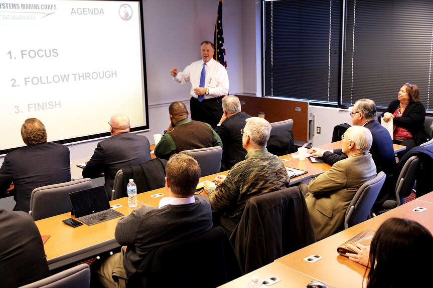 Michael Halloran, director of science and technology at Program Executive Officer Land Systems, addresses business representatives Jan. 30 at the Industry Interface Council in Dumfries, Va. Led by Marine Corps Systems Command, the council meets quarterly to enhance the command's effectiveness and glean ideas and feedback from industry leaders about improving communications.