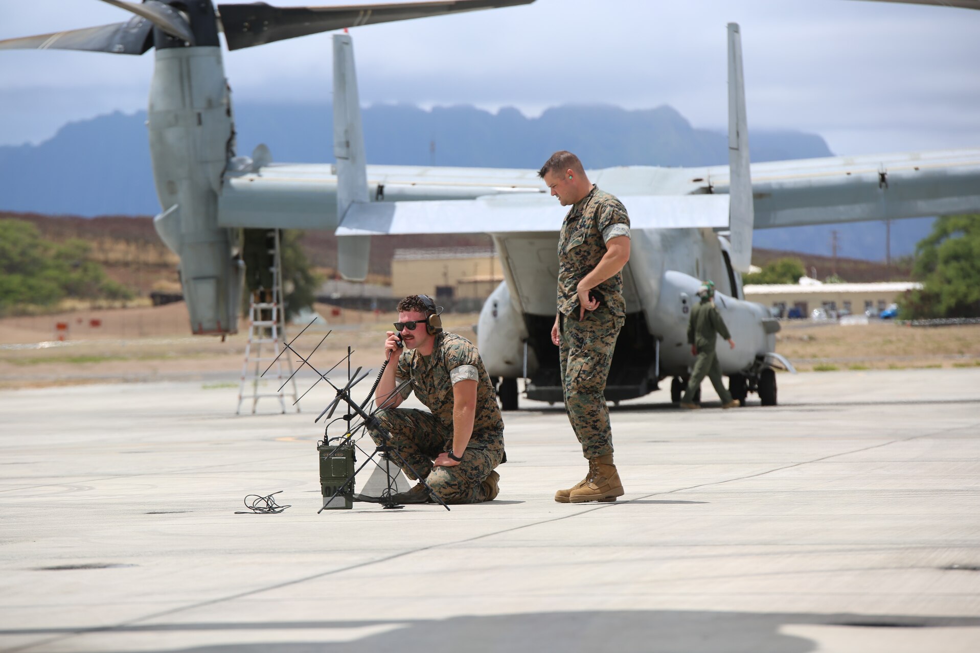 Cpl. Brooks Woodhill (kneeling), a transmissions systems operator, and Staff Sgt. Thomas King, a transmissions chief, both of 3rd Marine Regiment, use the Mobile User Objective System during Island Marauder 21 Aug. 11 at Marine Corps Base Hawaii as the Marines of VMM-268 prepare their aircraft to support. Island Marauder is an annual, Marine Corps Systems Command-led exercise enabling Marines to assess and familiarize themselves with communications gear. This year’s exercise was nested under the Navy’s Large Scale Exercise 21. (U.S. Marine Corps photo by Ashley Calingo)