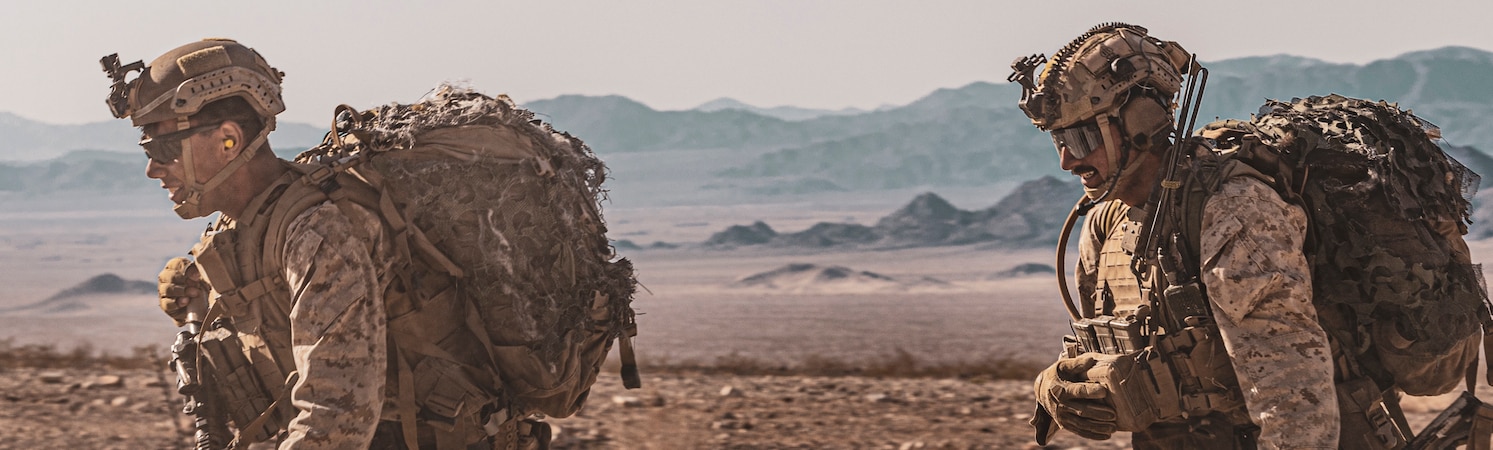 U.S. Marines with Echo Company, 2nd Battalion, 2nd Marine Regiment, 2nd Marine Division, run through a simulated mine field during Integrated Training Exercise (ITX) 3-23 at Marine Corps Air Ground Combat Center, Twentynine Palms, California, April 14, 2023. ITX is designed to provide large forces the opportunity to command and control their Marines through a live-fire program incorporating every element of the Marine Air-Ground Task Force. (U.S. Marine Corps photo by Sgt. Armando Elizalde)